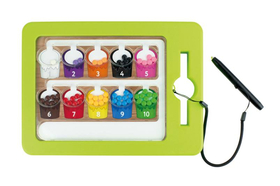 Στην άλλη πλευρά υπάρχει ένα πολύχρωμο παιχνίδι ταξινόμησης. Οι χρωματιστές μπίλιες πρέπει να τοποθετηθούν στα δοχεία που αντιστοιχούν στο σωστό χρώμα.