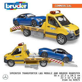 Όχημα oδικής bοήθειας Mercedes Sprinter απο τη Bruder, κατασκευασμένο από ποιοτικό, ανθεκτικό πλαστικό. Είναι πιστό αντίγραφο του πραγματικού. To Sprinter διαθέτει ανοιγόμενες πόρτες, ανθεκτικά "τζάμια" από πλαστικό, πτυσσόμενη ράμπα και τροχαλία. Συνοδεύεται από αυτοκίνητο Roadster, με αφαιρούμενη οροφή και σύστημα αλλαγής τροχών. Διαθέτει επίσης φώτα και ήχους. Διαστάσεις περίπου 50εκ. σε κλίμακα 1/16.