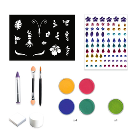 Περιεχόμενα: 4 κρεμώδη χρώματα προσώπου, 1 μεταλλιζέ σκιά, 1 μολύβι 1 πινέλο 2 σφουγγαράκια, 1 διπλό πινέλο σκιάς, 1 φύλλο επαναχρησιμοποιούμενων στένσιλ, περίπου 40 αυτοκόλλητα με στρας και διακοσμητικά στοιχεία 1 εικονογραφημένο βιβλιαράκι οδηγιών (3 εμφανίσεις) Κατασκευασμένο από χαρτί και χαρτόνι με πιστοποίηση FSC®.