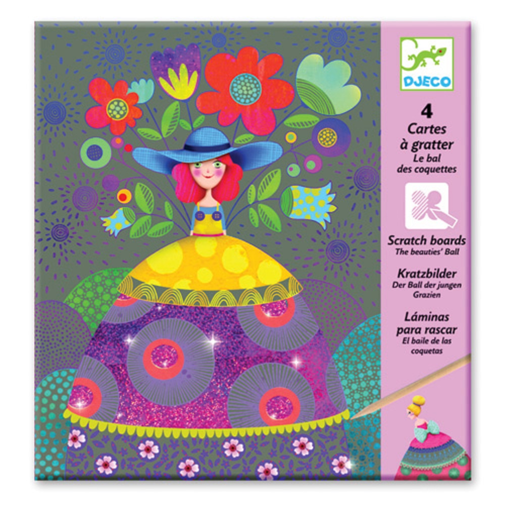 Καρτέλες ζωγραφικής από την εταιρεία Djeco τεχνοτροπίας 'Scratch'. Χρησιμοποιήστε το ειδικό εργαλείο- ξυλάκι και αποκαλύψτε τις φιγούρες των κοριτσιών με τα πολύχρωμα φορέματα με μεταλλικές λεπτομέρειες.