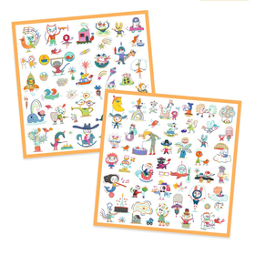 Ένα δημιουργικό σετ αυτοκόλλητων από την εταιρεία Djeco, γεμάτο μοναδικούς χαρακτήρες που εμπνέουν τα παιδιά να δημιουργήσουν τις δικές τους ιστορίες και σκηνές. Με 160 αυτοκόλλητα, τα παιδιά μπορούν να τα κολλήσουν ελεύθερα σε χαρτί, ζωγραφιές ή τετράδια, διαμορφώνοντας κάθε φορά έναν διαφορετικό κόσμο. Η δραστηριότητα αυτή ενισχύει τη δημιουργικότητα και το δημιουργικό παιχνίδι φαντασίας, ενώ δίνει τη δυνατότητα για προσωπική έκφραση. Η τοποθέτηση των αυτοκόλλητων συμβάλλει στην ανάπτυξη της λεπτής κινητικότητας και του συντονισμού ματιού-χεριού, ενώ η επιλογή και ο συνδυασμός των στοιχείων ενισχύει τη παρατηρητικότητα. Παράλληλα, αποτελεί μια ιδανική δραστηριότητα για ήρεμο και αυτόνομο παιχνίδι. Τα διπλά φύλλα επιτρέπουν στο παιδί να χρησιμοποιεί ξανά τα αγαπημένα του σχέδια, παρατείνοντας τη διάρκεια του παιχνιδιού. Περιεχόμενα: 160 χάρτινα αυτοκόλλητα 2 διαφορετικά φύλλα (με διπλά αντίτυπα) Κατασκευασμένο από χαρτί και χαρτόνι με πιστοποίηση FSC®.