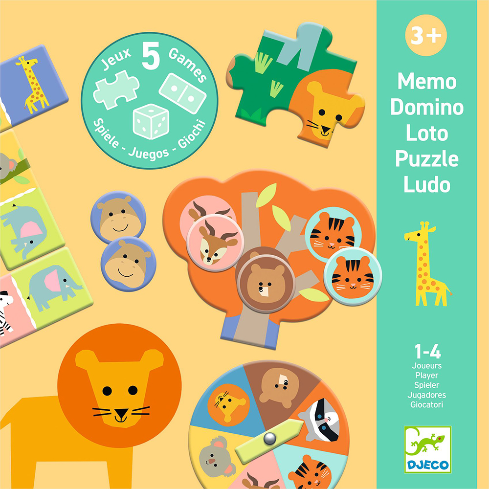 Σετ κλασικών εκπαιδευτικών παιχνιδιών από την εταιρεία Djeco, που συγκεντρώνει πέντε αγαπημένα παιχνίδια σε μία πρακτική συσκευασία: μνήμης, lotto, ντόμινο, παζλ και παιχνίδι με ζάρι.