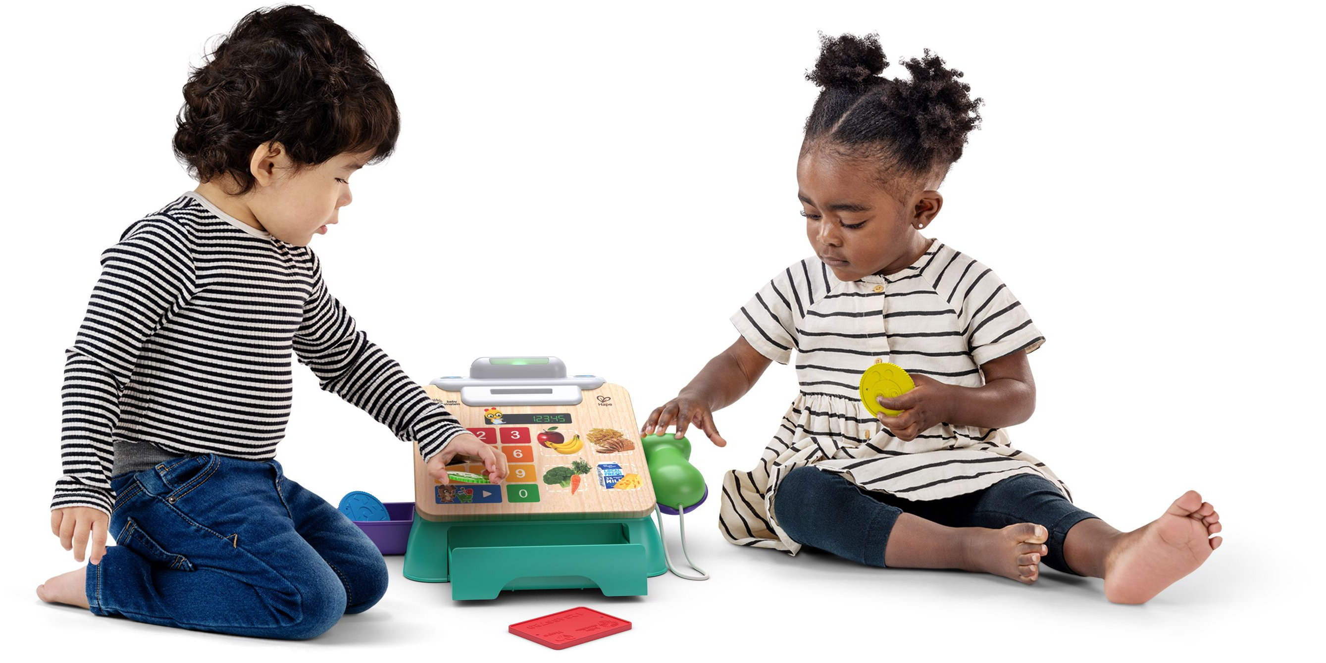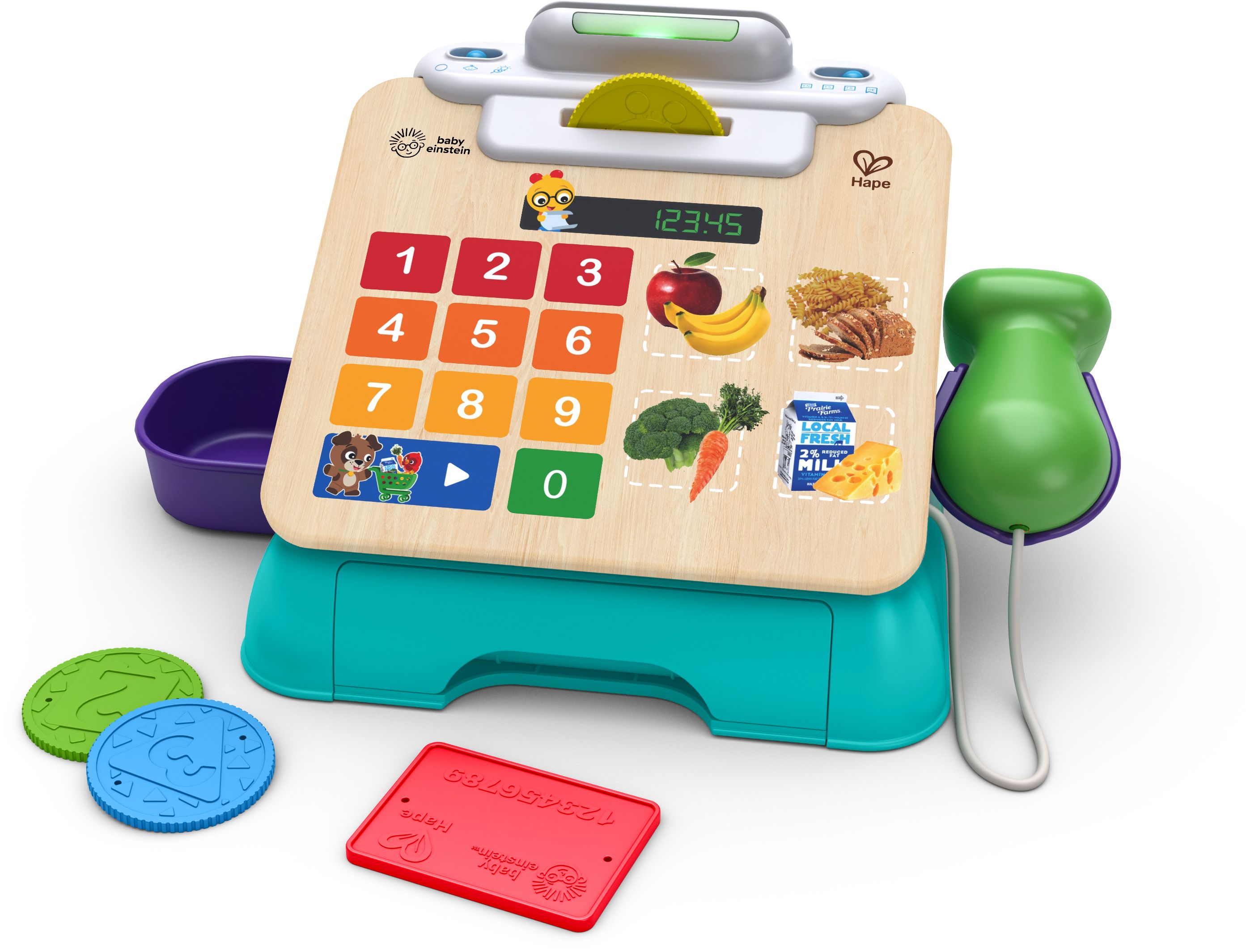 Ο σαρωτής «κουδουνίζει» ένα τρόφιμο για check out με φράσεις, μελωδίες, ήχους και φώτα. 16 εξαιρετικά υψηλής απόκρισης κουμπιά Magic Touch ανταποκρίνονται στο παραμικρό άγγιγμα του μωρού. Κλινγκ κλινγκ! Τοποθετήστε τα 3 νομίσματα για να πληρώσετε με μετρητά. Χρέωσε το στην κάρτα μου! Σύρετε την κάρτα για να πληρώσετε μέσω πίστωσης. Το συρτάρι μετρητών ανοίγει και κλείνει για να αποθηκεύσετε τα νομίσματα και την κάρτα. Η λειτουργία εξάπτει τη περιέργεια του μωρού με ηχητικά εφέ και μελωδίες, εισάγοντας τα πρώιμα θέματα αγορών.
