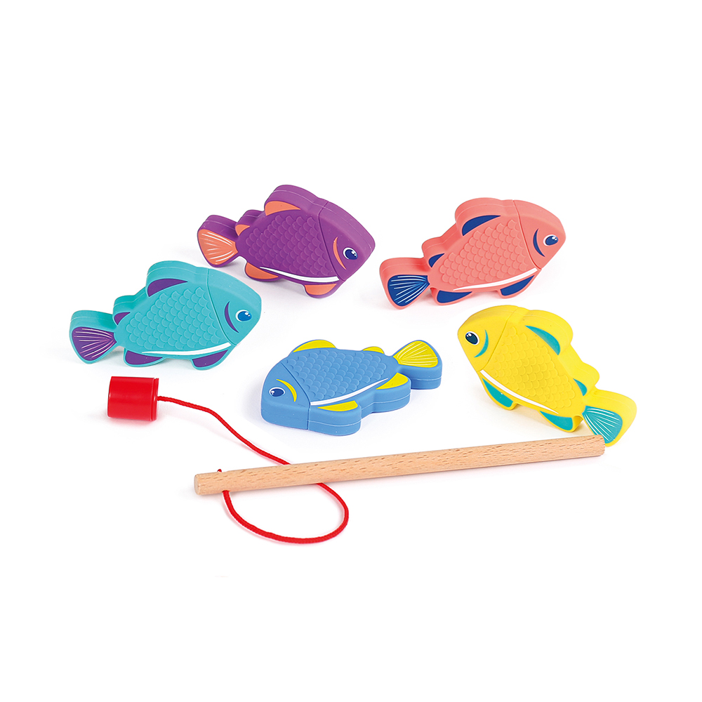 Το παιδί χρησιμοποιεί το ελαφρύ ξύλινο καλάμι με μαγνήτη για να πιάσει τα πολύχρωμα ψαράκια, εξασκώντας τη λεπτή κινητικότητα, τον συντονισμό χεριού-ματιού και τη συγκέντρωση.
