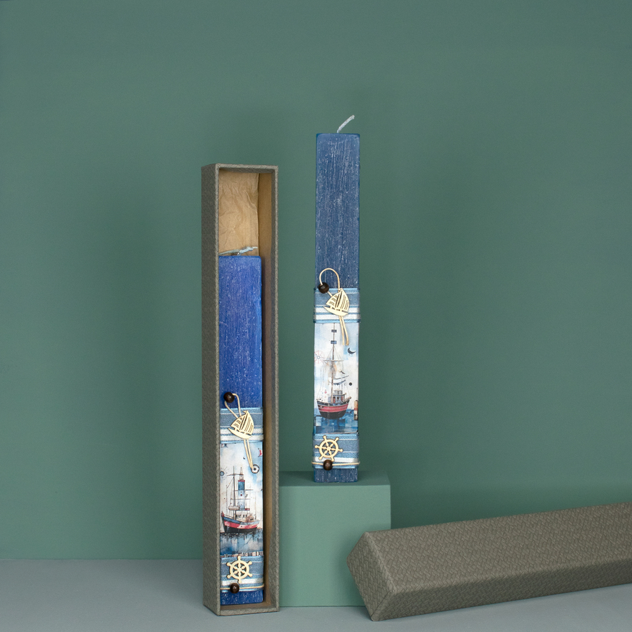 Γέραλης Χειροποίητη Λαμπάδα Κοντή Πλακέ "Καράβι" σε Κουτί (Χάρτινο) Navy κωδικός 24077N
