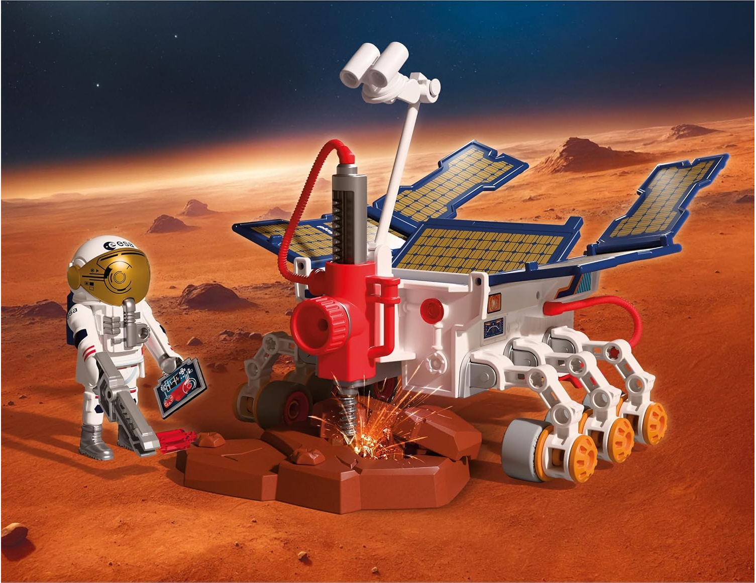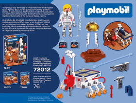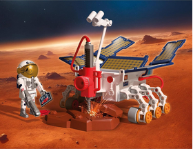 Δημιουργήθηκε σε συνεργασία με τον Ευρωπαϊκό Οργανισμό Διαστήματος (ESA) – Η PLAYMOBIL φέρνει τη γοητεία της διαστημικής έρευνας μέσα στα παιδικά δωμάτια! Μία νέα αποστολή στον Άρη ξεκινά με το ρομποτικό όχημα εξερεύνησης! Εξοπλισμένο με δράπανα, κάμερες και αισθητήρες υψηλής τεχνολογίας, το όχημα ψάχνει βαθιά κάτω από την επιφάνεια για ίχνη ζωής. Τα ανοιχτά ηλιακά πάνελ παρέχουν την απαραίτητη ενέργεια για τις επιστημονικές συσκευές: Πανοραμικές κάμερες και κάμερες κοντινών λήψεων βοηθούν στην επιλογή πολλά υποσχόμενων σημείων, ενώ ραντάρ και φασματόμετρα εξετάζουν το έδαφος. Τα δείγματα αναλύονται με ειδικά όργανα.