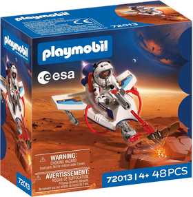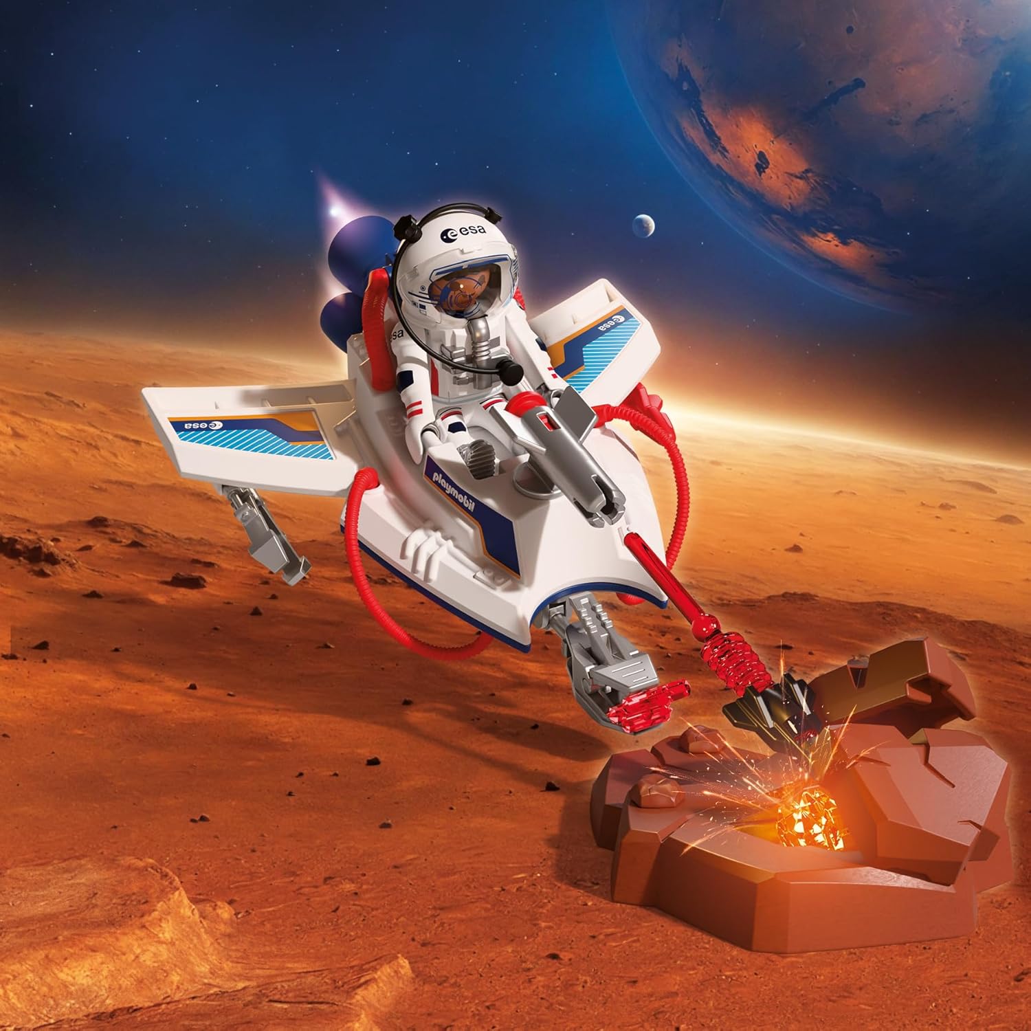 Δημιουργήθηκε σε συνεργασία με τον Ευρωπαϊκό Οργανισμό Διαστήματος (ESA) – Η PLAYMOBIL φέρνει τη γοητεία της διαστημικής έρευνας μέσα στα παιδικά δωμάτια! Το διαστημικό σκάφος κινείται ακριβώς πάνω από την επιφάνεια του Άρη και σαρώνει το έδαφος για ιδιαίτερα ευρήματα. Έχει ήδη ανακτήσει έναν πολύτιμο κρύσταλλο με τη λαβίδα του – όμως φαίνεται ότι υπάρχουν πολλά περισσότερα στον βράχο! Τώρα σημαδεύει έναν σχηματισμό πετρωμάτων με το ειδικό βλήμα του για να φέρει στο φως κρυμμένους κρυστάλλους. Ετοιμαστείτε, λοιπόν, για συναρπαστικές περιπέτειες στον Κόκκινο Πλανήτη.