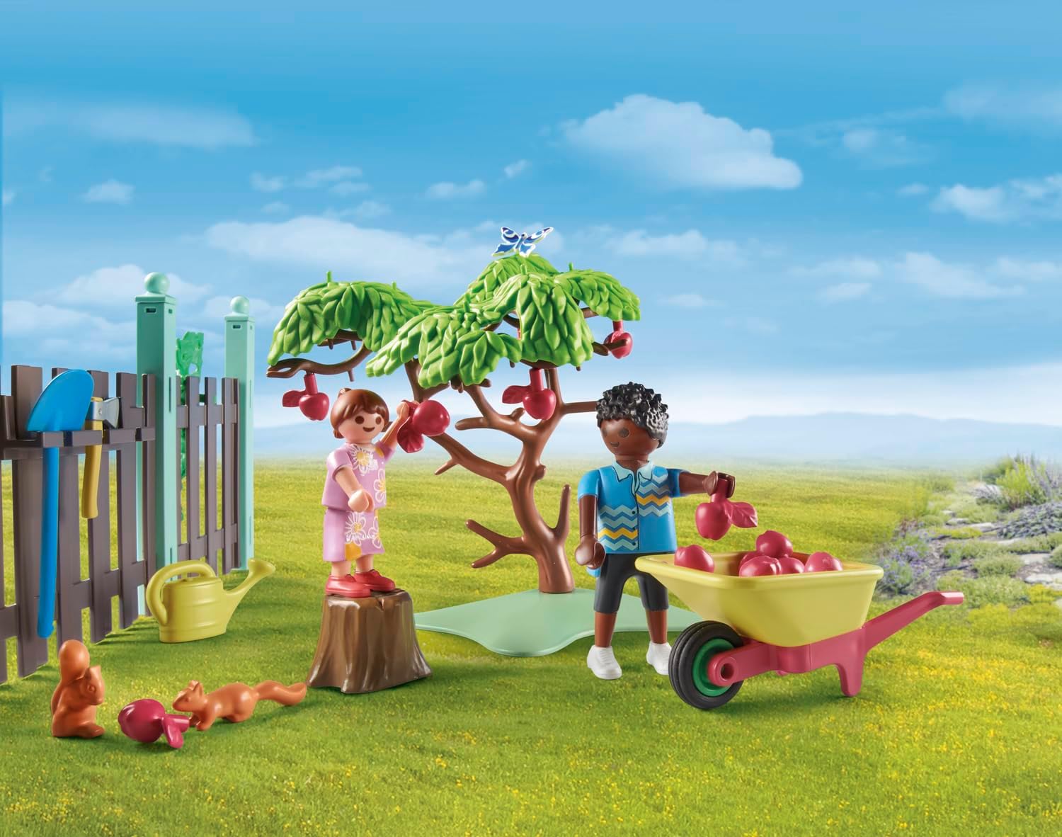 • Περιλαμβάνει δύο φιγούρες PLAYMOBIL, έναν κόκορα και τρεις κότες, έναν σκίουρο, ένα κοτέτσι, μια μηλιά και πολλά εργαλεία κήπου.