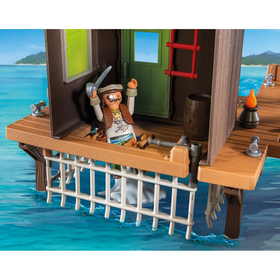 Το μεγάλο λιμάνι των πειρατών δεν είναι μόνο σταθμός για τα περήφανα πλοία, αλλά και ένας τρομερός χώρος φυλακής! Στη μεγάλη δεξαμενή-κλουβί κάτω από τον πύργο φρουράς, που είναι προσβάσιμη μέσω μιας κρυφής καταπακτής, μπορούν να κρατηθούν επικίνδυνοι καρχαρίες ή αντίπαλοι πειρατές! Από το παρατηρητήριο, αν φανεί κίνδυνος, χτυπά αμέσως συναγερμός: το κανόνι-νεκροκεφαλή και το μεγάλο περιστρεφόμενο βαρέλι με μικρότερα βαρέλια, που πέφτουν στους εισβολείς, προστατεύουν το λιμάνι από τις επιθέσεις!