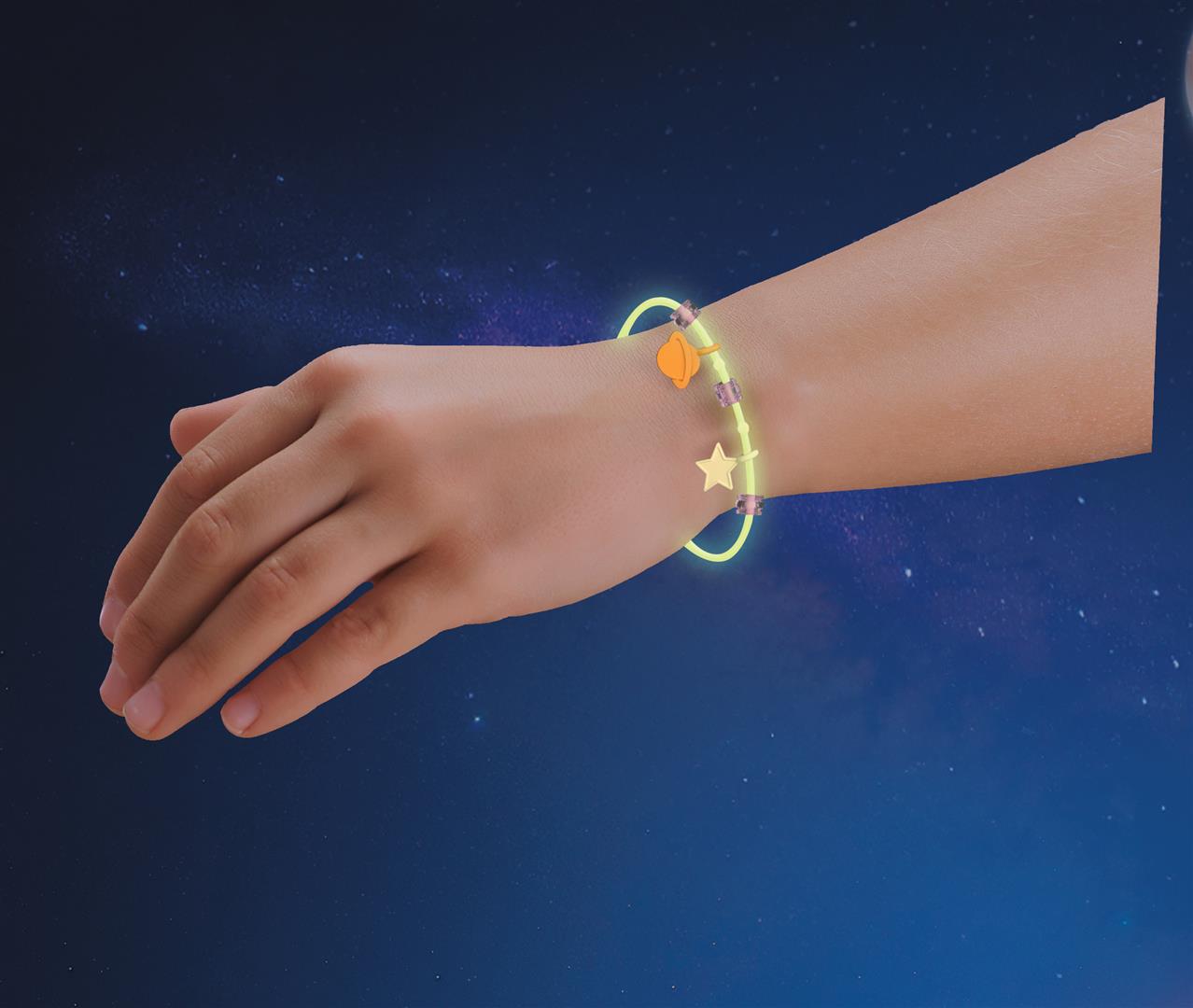 Η γενναία αστροναύτης έχει ξεκινήσει μία νέα αποστολή στο διάστημα! Μέσα στη διαστημική στολή της και εξοπλισμένη με το μαγικό αστέρι της, αναζητά νέους κόσμους και κρυμμένα μυστικά. Το βραχιόλι, που φωσφορίζει στο σκοτάδι, της δείχνει – όπως και σε εσάς – τον δρόμο μέσα από τα αστέρια.