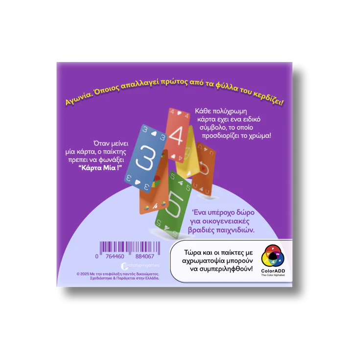 Με απλούς κανόνες, είναι ιδανικό για οικογένειες και φίλους κάθε ηλικίας. Σχεδιασμένο σύμφωνα με τον Κώδικα ColorADD, είναι προσβάσιμο και για παίκτες με αχρωματοψία, καθώς τα χρώματα αναγνωρίζονται εύκολα από όλους, εξασφαλίζοντας δίκαιο και διασκεδαστικό παιχνίδι για όλους.