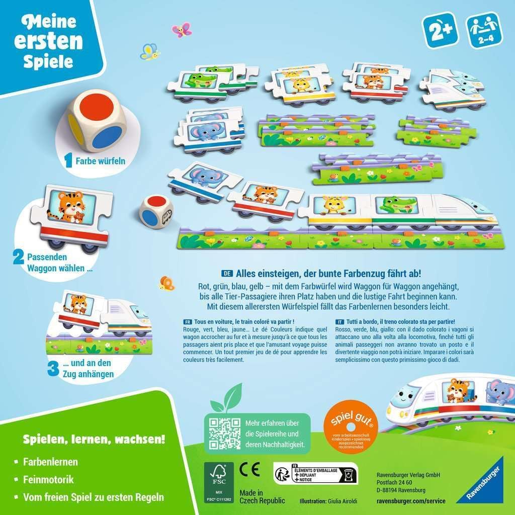 Το ένα χρωματιστό βαγόνι μετά το άλλο, ενώνονται στη μηχανή του τρένου μέχρι να συμπληρωθεί ο συρμός και να ξεκινήσει το διασκεδαστικό ταξίδι. Χάρη στο συναρπαστικό και δημοφιλές θέμα του σιδηροδρόμου, τα παιδιά μαθαίνουν τα βασικά χρώματα με πολύ εύκολο και διασκεδαστικό τρόπο. Το χρώμα στο ζάρι καθορίζει ποιο βαγόνι θα τοποθετηθεί και μέσω της επανάληψης του παιχνιδιού και της δυνατής εκφώνησης του χρώματος κάθε φορά, τα παιδιά μαθαίνουν πολύ γρήγορα τα χρώματα.